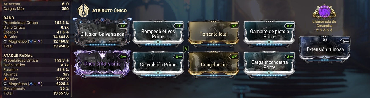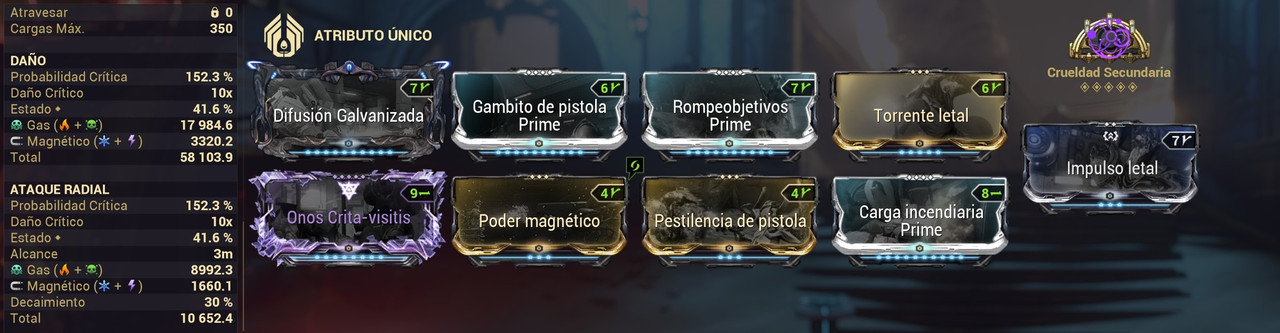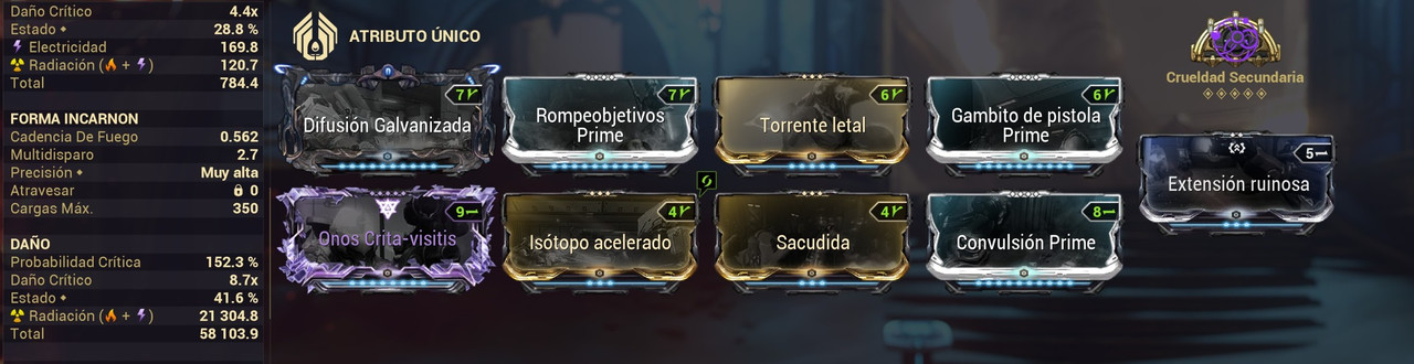 PRIMED PISTOL GAMBIT + RIVEN : obtienes una probabilidad critica base de 104% y en modo incarnon un 152% de probabilidad critica lo cual ayuda con los criticos rojos